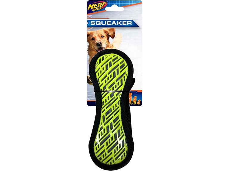 - (1) Nerf Dog Force Grip Barbell Dog Toy with Interactive Squeaker, Lightweight, Durable and Water Resistant, 8 Inches, for Medium/Large Breeds, Single Unit, Green/Gray, One-Size-for-Most