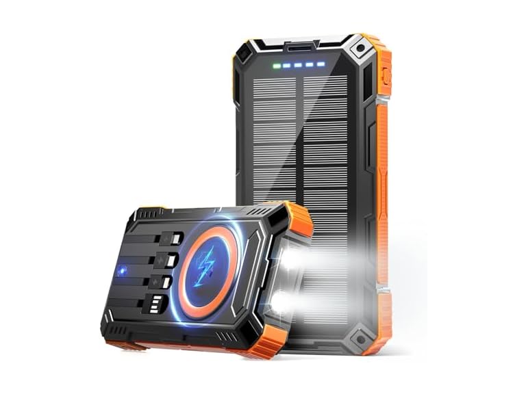 - 【All-in-One Charging—Wireless + Built-In Cables】No more tangled cords or forgotten wires. This mega-capacity bank comes with 4 integrated charging cables (USB-A input, USB-C, Micro-USB, Lightning), 2 USB ports, plus wireless charging, so you can power up to 6 devices simultaneously. Need speed? The 15W USB-C fast charge boosts your phone from 0% to 50% in just 30 minutes. Grab it, pack it, and power everything—without carrying extra cables.