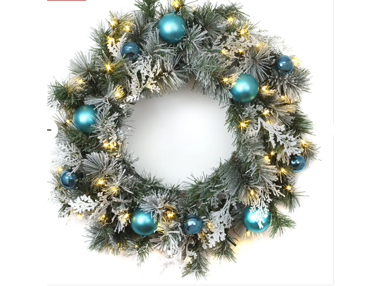 This attractive Snowy Tinkham Pine wreath features snow-dusted evergreen and bristle branches decorated with assorted blue ball ornaments and snowy cedar tips. It is pre-lit with 50 battery operated warm white LED lights that are energy efficient and long lasting. Included is an option for 6 hours ON/18 hours OFF timed operation. This holiday wreath can be displayed on doors, walls, and windows in indoor or covered outdoor locations.