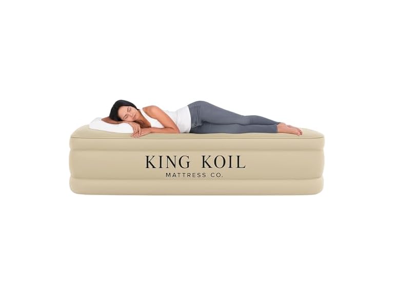 - KING KOIL LUXURY air mattresses are the pinnacle of premium comfort and luxury. Elevate your sleep experience with our queen-sized airbed, engineered for unrivaled support through an innovative coil-beam design, plush pillow top, and velvety soft flocking layer. Constructed with waterproof, puncture-resistant, and ultra-durable materials, this air mattress delivers hotel-quality rest night after night. Indulge in the ultimate combination of superior craftsmanship, luxurious comfort, and lasting durability, because you deserve the best