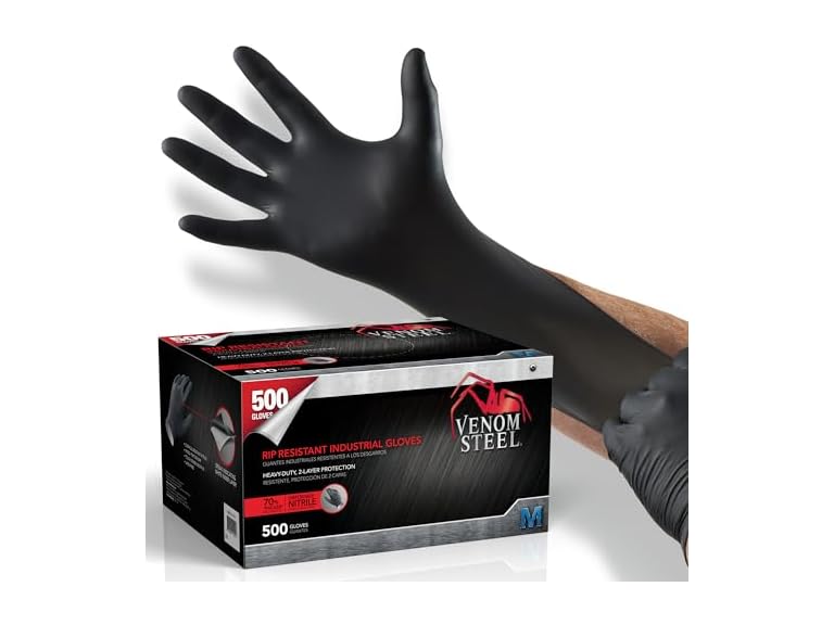 - (1) Venom Steel Industrial Nitrile Gloves, Chemical Resistant Disposable Black Gloves, Latex-Free, Powder-Free, Textured Grip, Heavy Duty Two-Layer Protection, 6 mil, Medium (Pack of 500)