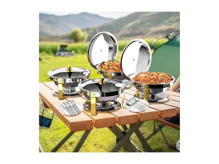 - Chafing Dishes for Buffet 4 Pack, 5QT Round Stainless Steel Food Warmers with Semi-Gold Finish - Complete Buffet Set w/Tongs & Serving Spoon, Ideal for Parties, Catering, Weddings, Event