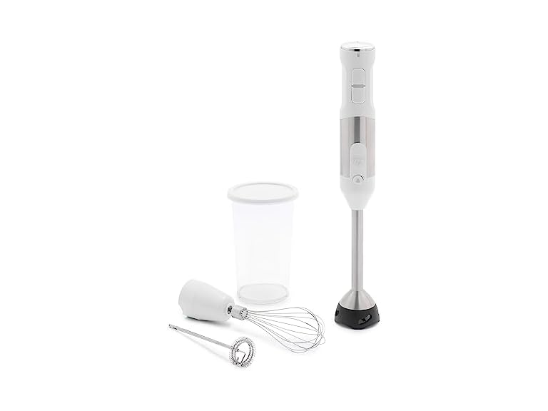 - (1) GreenLife 500-Watt Immersion Electric Handheld Stick Blender with Stainless Steel Blades, Whisk, Frother, Measuring Cup and Lid, Soups, Puree, Cake, Multi-Speed Control, Portable, White