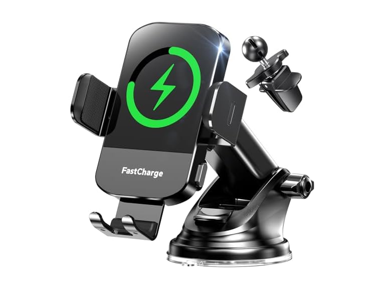 - 【Intelligent Identification & Smart Charging】Experience effortless and safe driving with CHGeek car phone mount. It automatically clamps your phone when connected, providing convenience and enhanced safety. The charger's arms open with a simple touch on the 2 sides button. Plus, it intelligently powers off and protects your phone's battery when it's fully charged.Automatically secures your phone upon contact—zero shaking on bumpy roads.Fits phones from 4” to 7.1”.