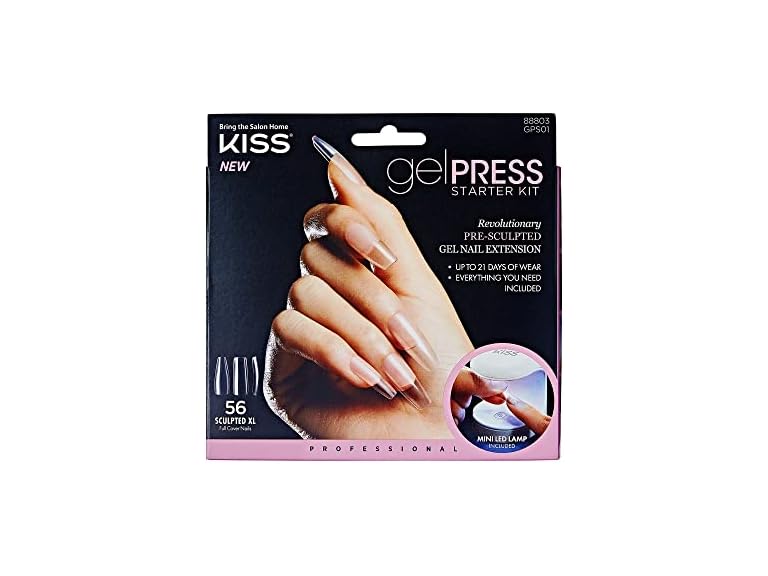 (1) KISS GelPress Professional Gel Nail Starter Kit, Includes 56 Pre-Sculpted Gel Nail Extensions, UV Gel, 1 LED Lamp, 6.7 mL Primer, 1 Nail File, 1 Manicure Stick