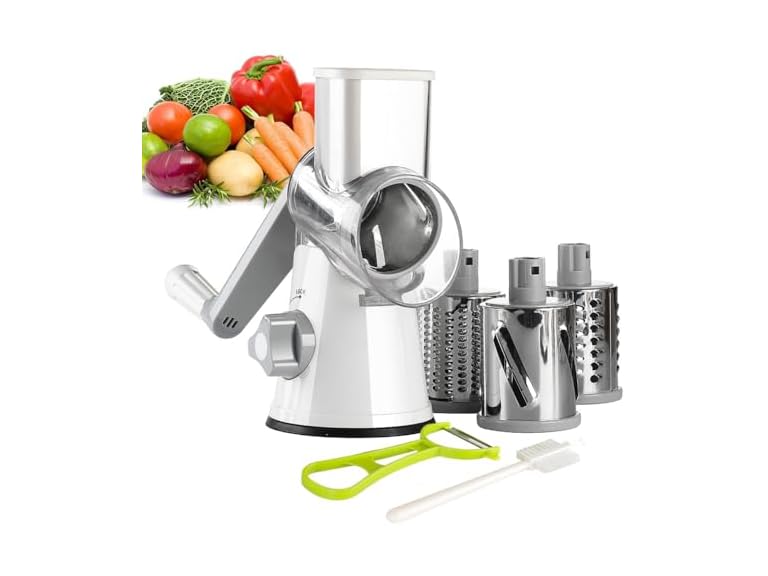 - (1) Ourokhome Rotary Cheese Grater Hand Crank, Kitchen Shredder Speed Mandolin Slicer Nuts Grinder with Handle and Drum Blades for Cheese, Vegetable, Walnuts, Chocolate, Potato, Carrot, 3 Blades, White