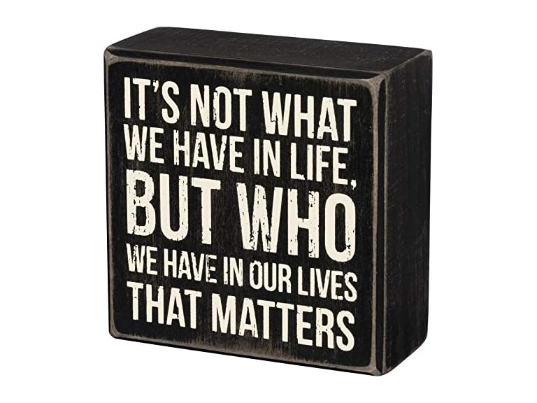 A black and white wooden box sign featuring a distressed "it's not what we have in life, but Who We Have in our lives that matters" Sentiment. Measures 4 x 4-inches and complements well with coordinating design pieces or existing decor. Easy to hang or can free-stand alone. Carefully BUY ONLY FROM AMAZON or trusted Amazon partners to guarantee authentic Primitives by Kathy gifts and decor with premium quality printing, stitching, and fabrics. In 1997, Kathy made her first "primitive candle box" By hand, taking care into each detail from the sanded edges to the type of ribbon tied on the wire handles, each was a work of passion. As Primitives by Kathy grows, the company works to give back, starting with an initial relationship with Goodwill Services and expanding into several more charitable causes held both by the company and those the company supports on behalf of their employees. They are constantly inspired by the people, places and things around us. Kathy travels the world to pull inspiration first hand from cultures around the globe. Look for all of Primitives by Kathy for inspirational, fun, sarcastic, and heart-warming gifts and home decor. You'll want to have one for yourself and another for someone you care about.