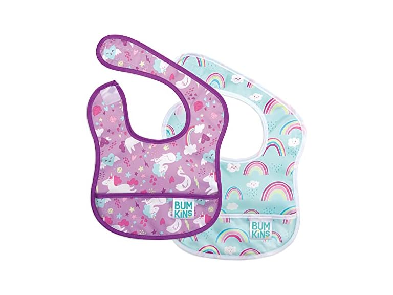- (1) Bumkins Bibs, for Baby Girl or Boy, Infant 3-9 Mos, Essential Must Have for Eating, Feeding, Baby Led Weaning, Mess Saving Waterproof Soft Fabric, Starter Bib 2-pk Unicorns, Rainbows Blue and Purple