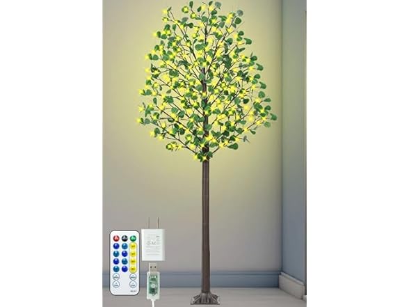 - 🎄【Unique Design】7 Ft Lighted Eucalyptus Tree with 340 eucalyptus leaves, 170 warm white LED lights, natural looking eucalyptus leaves, and brown trunk. The led lights are built into the tree(not wrapped around the branches), with no wires visible, making them appear more real and vivid.