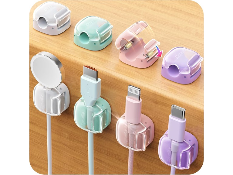- Dual Spring & Clasp Lock Stays Closed Under Pull: These cable clips feature a dual spring locking design that keeps charging cables firmly in place, preventing pop-open failures common with magnetic clips and avoiding cable damage caused by tight silicone holders. Ideal for desks, bedside tables, workstations, and car interiors, it keeps cables firmly in place while protecting jackets for long-term daily use.
