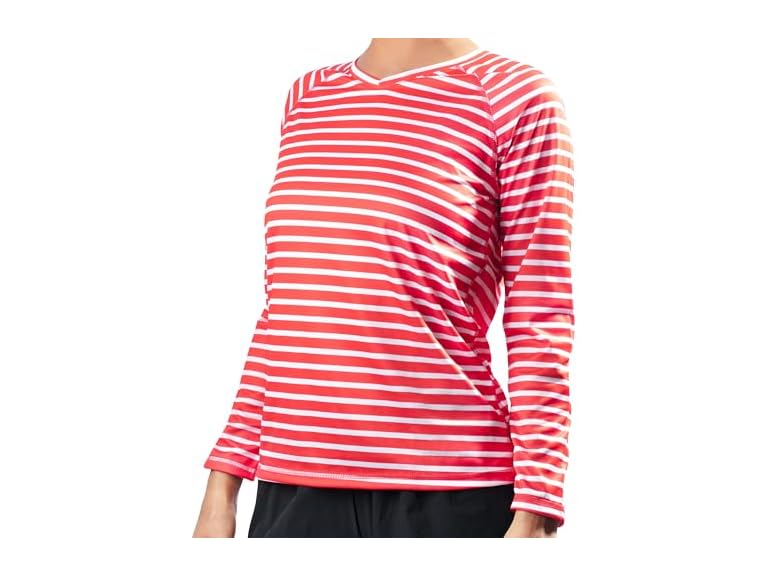 - Relaxed-fit striped swim shirt featuring V-neckline and raglan-seam long sleeves