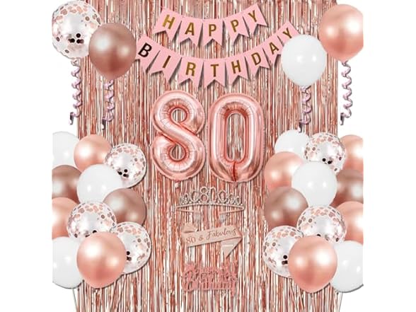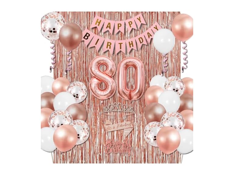 - 80th Birthday Decorations Set: This set includes a 80th birthday sash, 80th tiara/crown, "Happy Birthday" banner, 40-inch "80" number balloons, a "Happy 80th Birthday" cake topper, 2 rose gold tassel curtains (3.2 X 8.2ft), 20 rose gold latex balloons, 10 white latex balloons, 10 rose gold metallic balloons, 10 rose gold confetti balloons (12 inch), 100 balloon glue dots, 1 balloon ribbons and 1 straw. You will organize the perfect happy 80th birthday party.