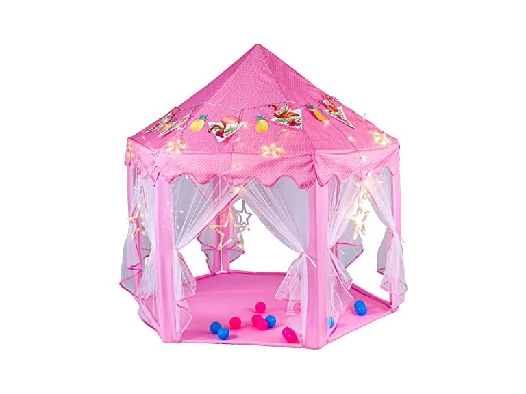 - Package Include: 1 x Princess Castle Play Tent, 1 x 138 LED Star String Lights, 1 x Flamingo Pineapple Triangle Banners, 6 x Vertical Poles, 12 x Horizontal Poles, 12 x Roof Poles, 1 x Roof Hexagonal Connector, 6 x Quadrangle Connectors, 6 x Triangle Connectors, 6 x Straight Connectors.