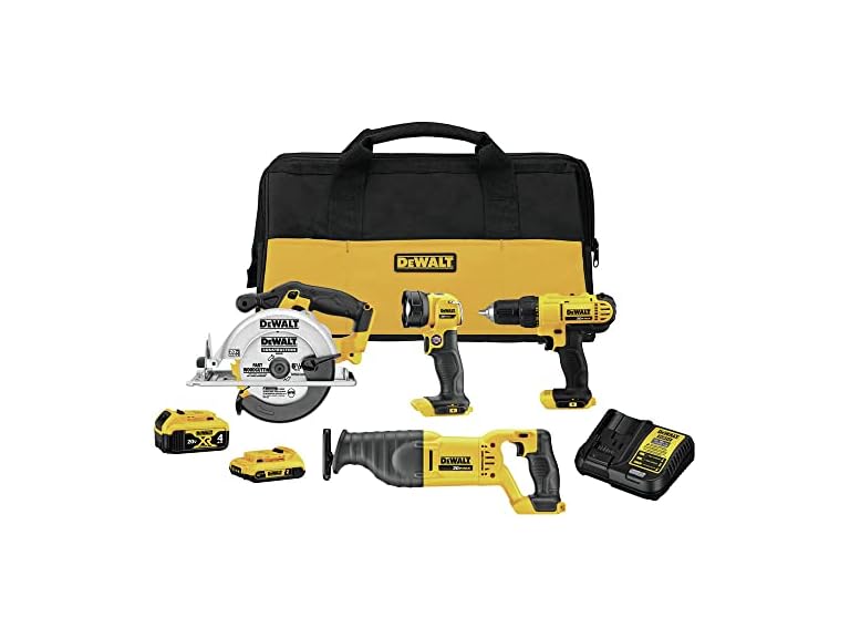 - (1) DCD771 20V MAX* 1/2 in. Cordless Drill/Driver; (1) DCS381 20V MAX* Cordless Reciprocating Saw; (1) DCS393 20V MAX* 20V MAX* 6-1/2 in. Cordless Circular Saw; (1) DCL040 20V MAX* Cordless LED Work Light; (1) DCB203 20V MAX* 2.0Ah Lithium Ion Battery; (1) DCB204 20V MAX* 4.0Ah Lithium Ion Battery; (1) DCB112 Charger; (1) Kit Bag