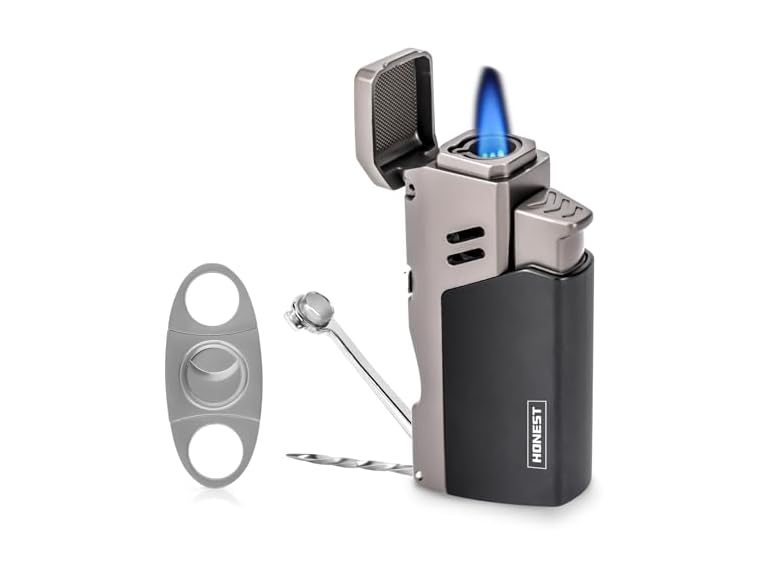 - 【All-in-One Cigar Lighter】The side of the cool lighters has a folding cigar punch and draw enhancer. The punch is made of sharp stainless steel for easy punching of cigars. The barbed design of the draw enhancer makes it easy to solve overfilling and clogging problems, allowing you to enjoy your cigars more smoothly.