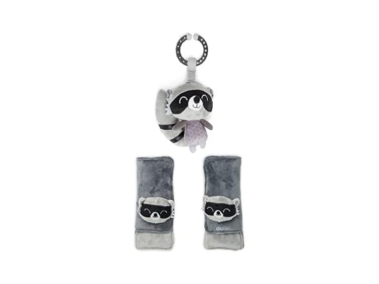 - (1) Diono Baby Racoon Character Car Seat Straps & Toy, Shoulder Pads for Baby, Infant, Toddler, 2 Pack Soft Seat Belt Cushion and Stroller Harness Covers Helps Prevent Strap Irritation