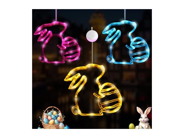 - (1) ontigola 3PCS Easter Window Lights Hanging Bunny Outdoor Decoration Pink Blue Yellow Bunny Light Door Sign Easter Decoration Rabbit String Lights up Room Wall Decor with Suction Cup for Easter Party Supplies