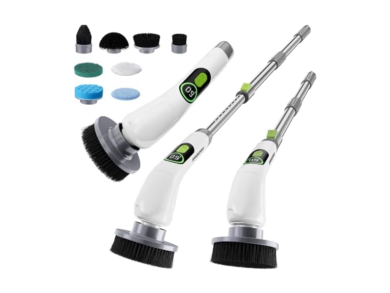 - Detachable Extendable Handle: Our electric spin scrubber has a detachable & adjustable rod that can be extended to 38.8 - 48.6 inches. The shower scrubber is good for cleaning work at high places but also allows you to say goodbye to bending over and kneeling to work, making cleaning work relaxed and more effective