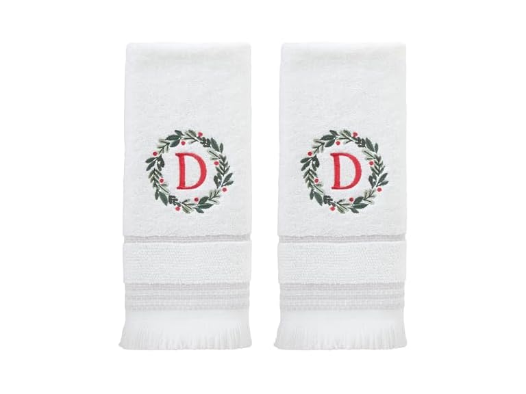 - (1) SKL Home Christmas/Winter Wreath Monogram Hand Towel, 2pc Set for Bath/Kitchen/Bar & Gift, White (Your Choice of Style)