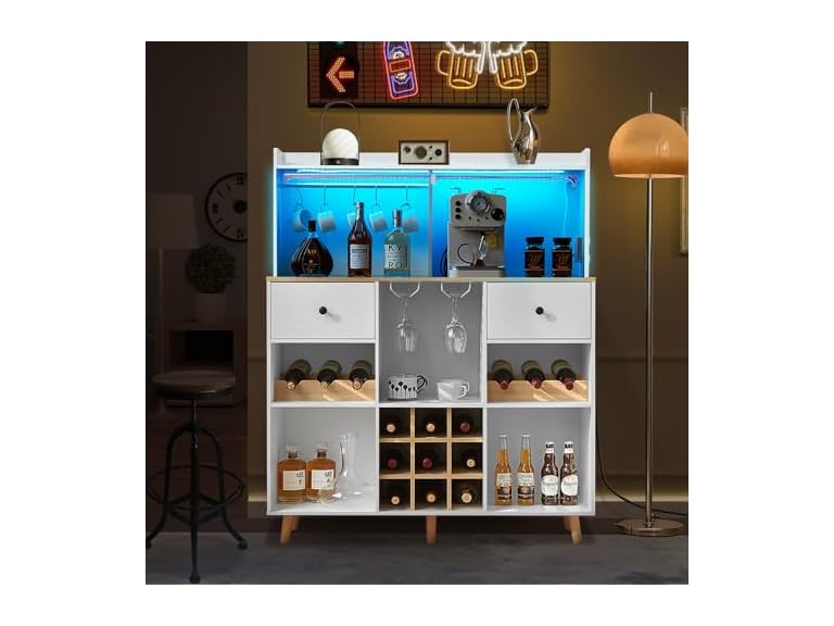 - (1) JanflyHome Wine Bar Cabinet with Power Outlet & LED Light, Bar Storage Cabinet with Drawers and Removable Shelves, Wine Cabinet Sideboard for Liquor and Glasses, Coffee Bar Cupboard,Woot