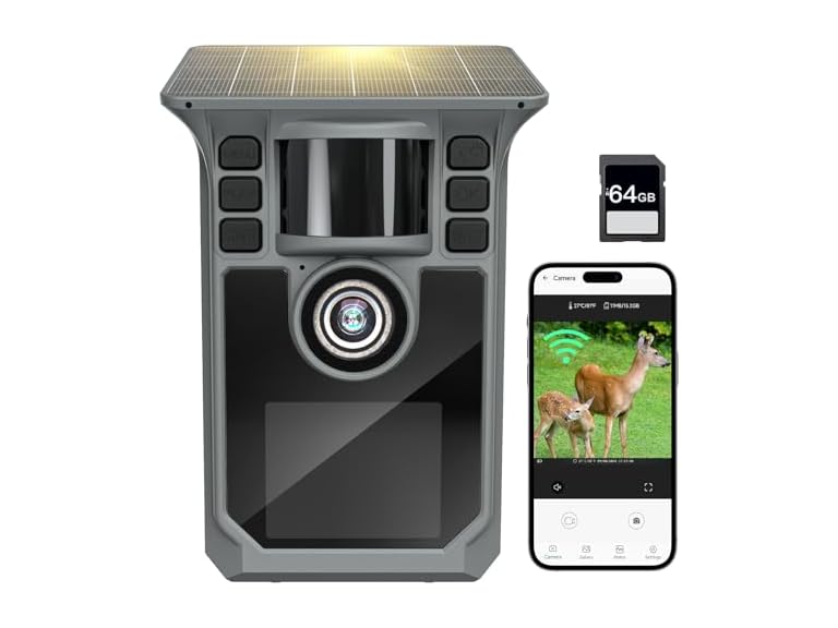 - 【Solar Powered Trail Camera and 64GB Memory Card】 Experience the ultimate in convenience and environmental protection with our solar trail camera! Equipped with a built-in 5000mAh rechargeable battery and a top-mounted solar panel, this camera uses solar energy to minimize battery consumption and extend usage time. Ensure long-term performance without frequent replacement. The 64GB memory card provides buyers with more storage space.