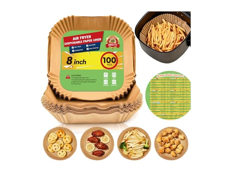 - (1) Stoear Air Fryer Paper Liners Disposable: 100Pcs 8 Inch Special Square Liners for Air Fryer, Grease and Water Proof Non Stick Basket Parchment Paper