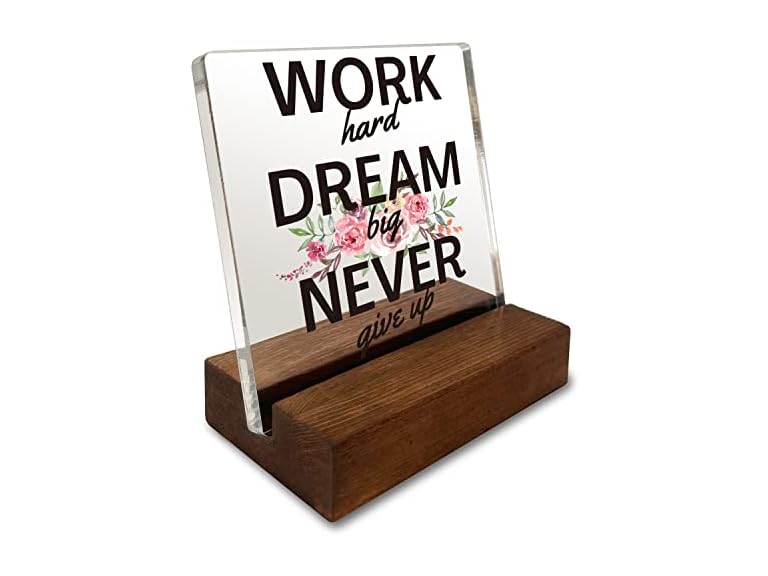 - (1) vizuzi Dream Big Work Hard Inspirational Quotes Desk Decor Gifts For Women Best Friend Encouragement Office Inspiration Positive Plaque Acrylic With Wooden Stand Sign for Cowoker Friend Women Gift