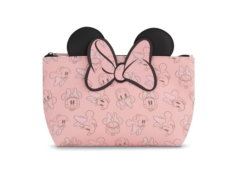 (1) FUL Disney Minnie Mouse Women's Makeup Bag, 3D Bow and Ears Small Travel Cosmetic Zipper Pouch Organizer, Blush