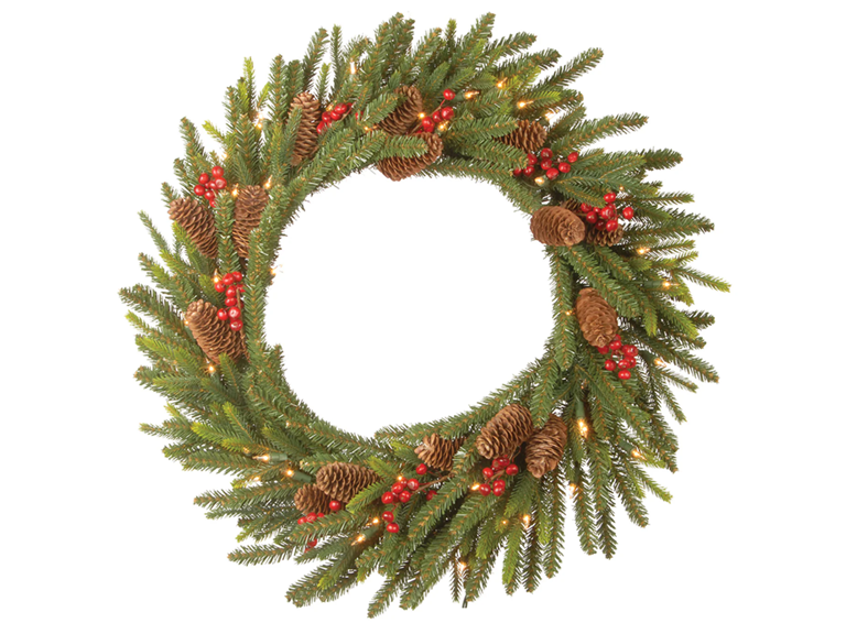 This Dorchester Fir wreath features Feel Real branch tip technology, creating a decoration with remarkable realism. These crush-resistant branch tips are molded from real tree branches for an authentic appearance. This wreath is trimmed with red berries and pine cones. It is pre-lit with 50 battery operated warm white LED lights that are energy efficient and long lasting. Includes a 6 hours ON/18 hours OFF timed operation. Display this wreath on doors, walls and windows in indoor or covered outdoor locations.
