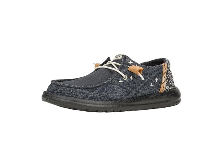 The Hey Dude Wendy Crafted Boho sneakers are the perfect blend of style and comfort. The textile upper and lining make these sneakers both breathable and stylish. The removable memory foam cushioned insole provides maximum comfort while also reducing sweating and odors. The Flex & Fold feature supports healthy feet and allows for complete freedom of movement. Made with a special machine washable fabric cleaning is a breeze. Slip-on closure with decorative elasticized laces. Branding on the back heel tab. Rounded moc toe silhouette. Treaded rubber outsole. Imported.