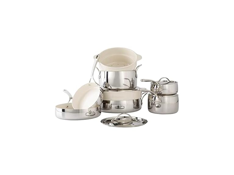 - (1) Bloomhouse 12 Piece Triply Stainless Steel Pots and Pans Cookware Set w/Non-Stick Non-Toxic Ceramic Interior, Ceramic Steamer Inserts, & 12 Protective Care Bags