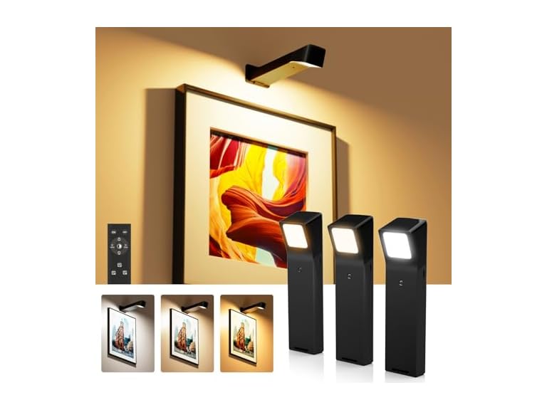 - 🖼️ Wide Compatibility & Easy Installation: This light provides illumination for small frames ranging from 4×6 inches to 8×12 inches. The set of three lights is suited for family photos, diplomas, posters, or original artworks. Installation is quick and simple, using either adhesive strips or screws, offering a practical lighting option for rental spaces.