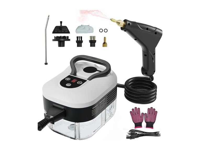 - 10-in-1 Versatile Accessories Set: Includes 2 large nylon brush, 1 small nylon brush, 1 copper brush, 1 copper nozzle, 1 flat window scraper, 1 towel cover, 1 extended nozzle, 2 spacers and 2 gloves. The steam cleaner for home is ideal for cleaning windows, kitchen appliances, tiles, upholstery, wheels, and more