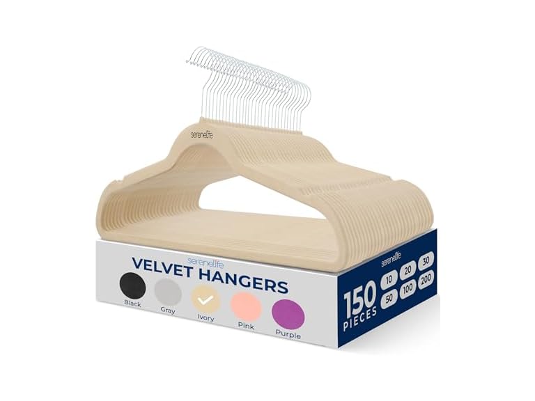 - SereneLife 150 Pack Velvet Hangers - Non-Slip with 360° Swivel Hook - Ultra-Thin, Lightweight, Space-Saving, Felt Hangers for Shirts, Sweaters, Hoodies, Kids Clothes & Dresses