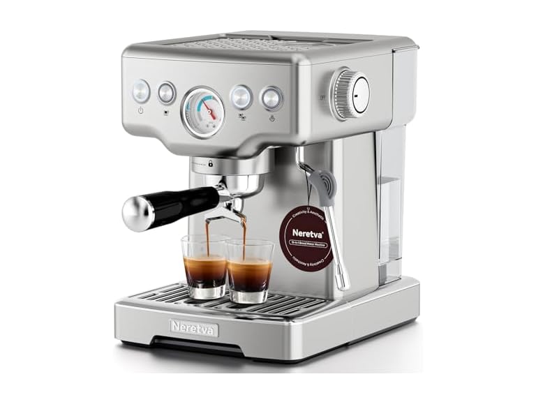 - VISIBLE PRESSURE GUAGE - With built-in pressure gauge, Neretva espresso makers shows the exact pressure helping you make adjustments according to your personal taste preferences. With a 15-bar pressure system and a robust 1450W boiler, the espresso machine can extracts premium coffee for lattes, cappuccinos, and more. Even beginners can make a great cup of coffee!!