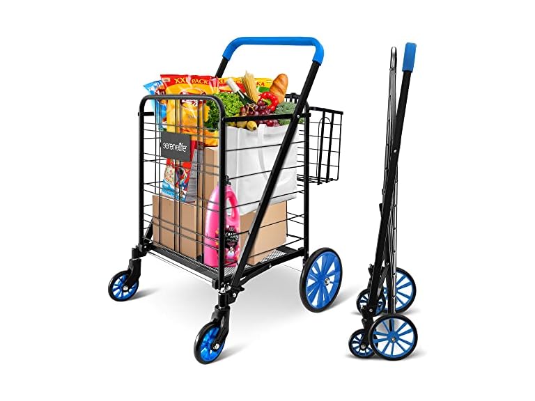 • (1) SereneLife Shopping Cart - Swivel Front Wheels, Portable and Collapsible Design, with Detachable Basket, Ideal for Grocery, Laundry, and Shopping, 110 lbs Weight Capacity