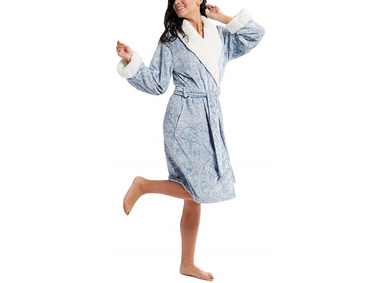 - The bathrobe comes with belt design for snug fitted styling and overalll cute modern design with sherpa collar and cuff trim accent for sophisticated look and added warmness.