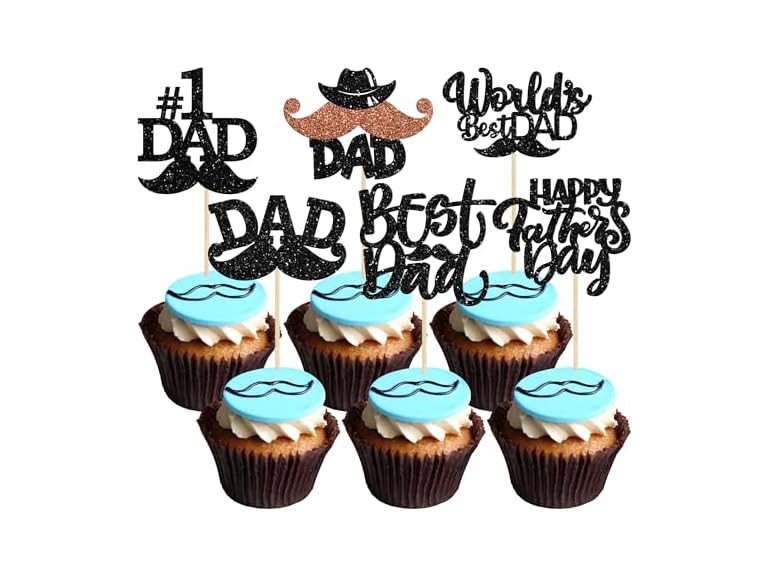 - (1) Gyufise 24Pcs Happy Father's Day Cupcake Toppers with Moustache Black Glitter World's Best Dad Cupcake Picks Decorations for Happy Father's Day Theme Party Cake Decorations Supplies