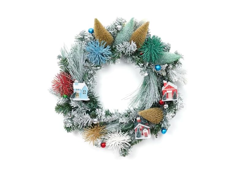 - (1) 24 in Christmas Wreath for Front Door, Xmas Village Wreath with Tree and Little House Decorations, Holiday Decor for Home Wall Window Indoor Outdoor Outside Winter