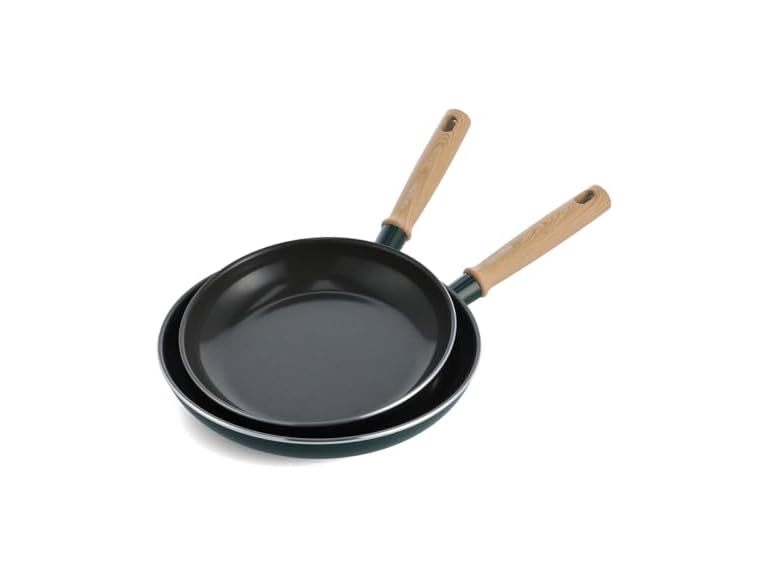 - (1) GreenPan Hudson Healthy Ceramic Nonstick, 9.5" and 11" Frying Pan Skillet Set, Vintage Wood Inspired Handle, PFAS-Free, Dishwasher Safe, Forest Green