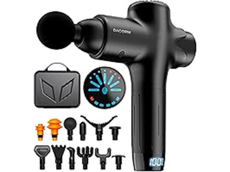 Musle Massage gun, 7 speed levels &12 massage heads, suitable different body needs, effectively relieve back, neck, arms, legs, muscle soreness.