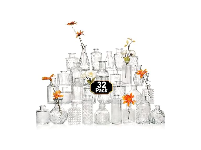 - Vintage Design: You get 32 glass bud vase, each small glass vase is decorated with etched patterns to further enhance its attractiveness. They are very classy and can be used in any environment, from elegant to simple and casual. They will become a beautiful decorative center on your window sill, dining table or wedding reception table