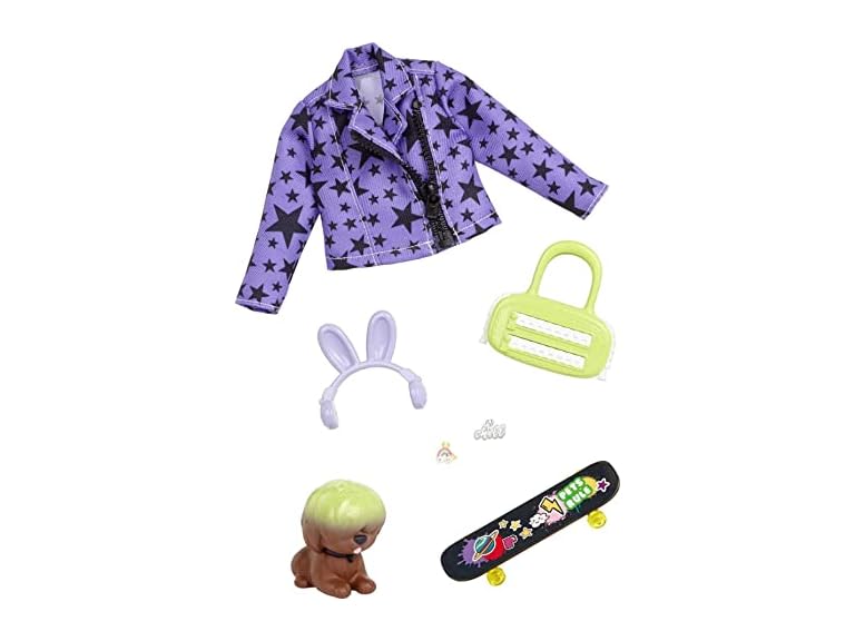 - Kids can bring even more EXTRA vibes to their Barbie dolls' looks with a purple, star-printed, faux-leather jacket with a working zipper and neon green handbag with oversized zipper details.