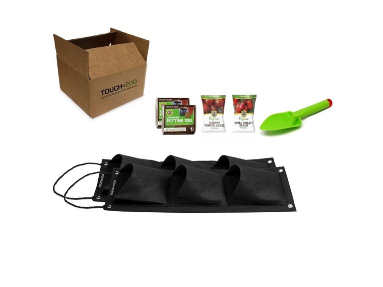 Hang them on a wall, over a balcony or off a deck, you can grow beautiful big cherry tomatoes anywhere! Better yet it is reusable, lightweight, economical and practical. Turning any sunny patio, deck fence or wall into a beautiful edible organic garden Each USA-made bountiful kit includes a recyclable and reusable flexible polypropylene planter, nylon rope for hanging and non-GMO seeds.