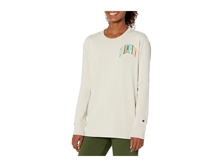 - (1) Champion Boyfriend, Oversized T-Shirt, Women's Cotton Long Sleeve Tee, Pebblestone, Medium