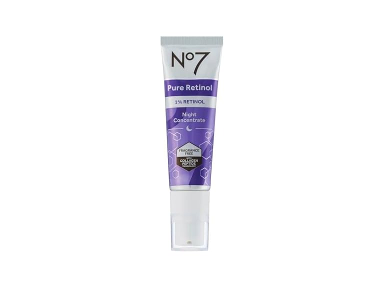 (1) No7 Pure Retinol 1% Night Concentrate - Anti Wrinkle Retinol Serum with Collagen Peptides & Niacinamide for Younger Looking Skin - Firming Face Serum for Fine Lines & Wrinkles (30ml)