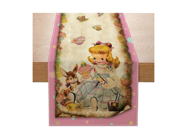 - 🐰 UNIQUE DESIGN: The designs of this retro Easter table runner are carefully selected, Use unique rabbit, girl, and other cute Easter elements, with vintage Easter style theme. while also achieving an unparalleled visual effect can add a romantic and warm festive atmosphere to your family or party.