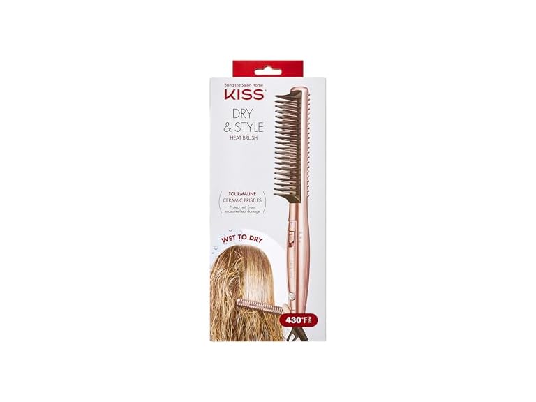 (1) KISS Dry and Style Heat Brush, Wet to Dry Detangling and Volumizing Hot Comb, Tourmaline Ceramic Bristles, 2 Temperature Settings, Ultra Lightweight Handle, 360° Swivel Power Cord