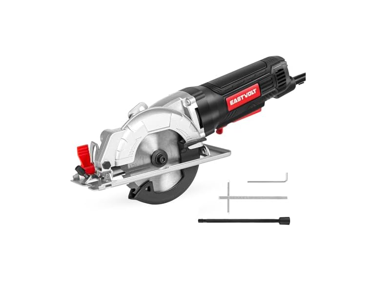 - Eastvolt Mini Circular Saw, 4.5A Electric Circular Saw with Scale Ruler, Dust Exhaust Pipe, Max Cutting Depth 1-11/16"(90°), 1-1/8"(45°), 4-1/2" 24T TCT Blade for Wood and Plastics