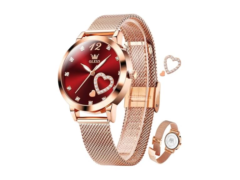 - 💎【 Sophisticated Design】:The red dial adorned with diamond hour markers and a delicate diamond heart, exudes a luxurious yet minimalist charm.The rose gold watch strap complements the red dial,making it ideal for the modern woman.This OLEVS watches for women effortlessly matches various ensembles from casual to formal.Whether you're dressing up for a special occasion or simply looking for a stylish everyday companion,this watch has got you covered.